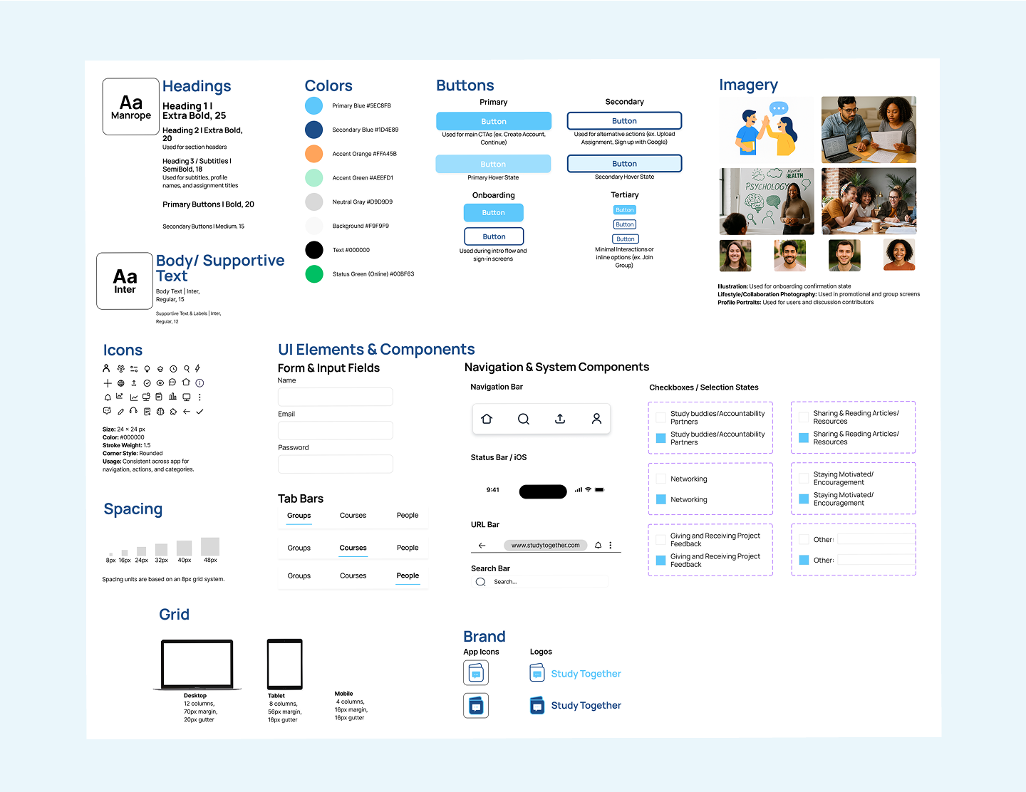 The Study Together Style Guide establishes the visual language used across the responsive web application. It documents the key elements that ensure consistency across screens, breakpoints, and interactions. This includes color, typography, buttons, spacing, grid, icons, imagery, and UI components.