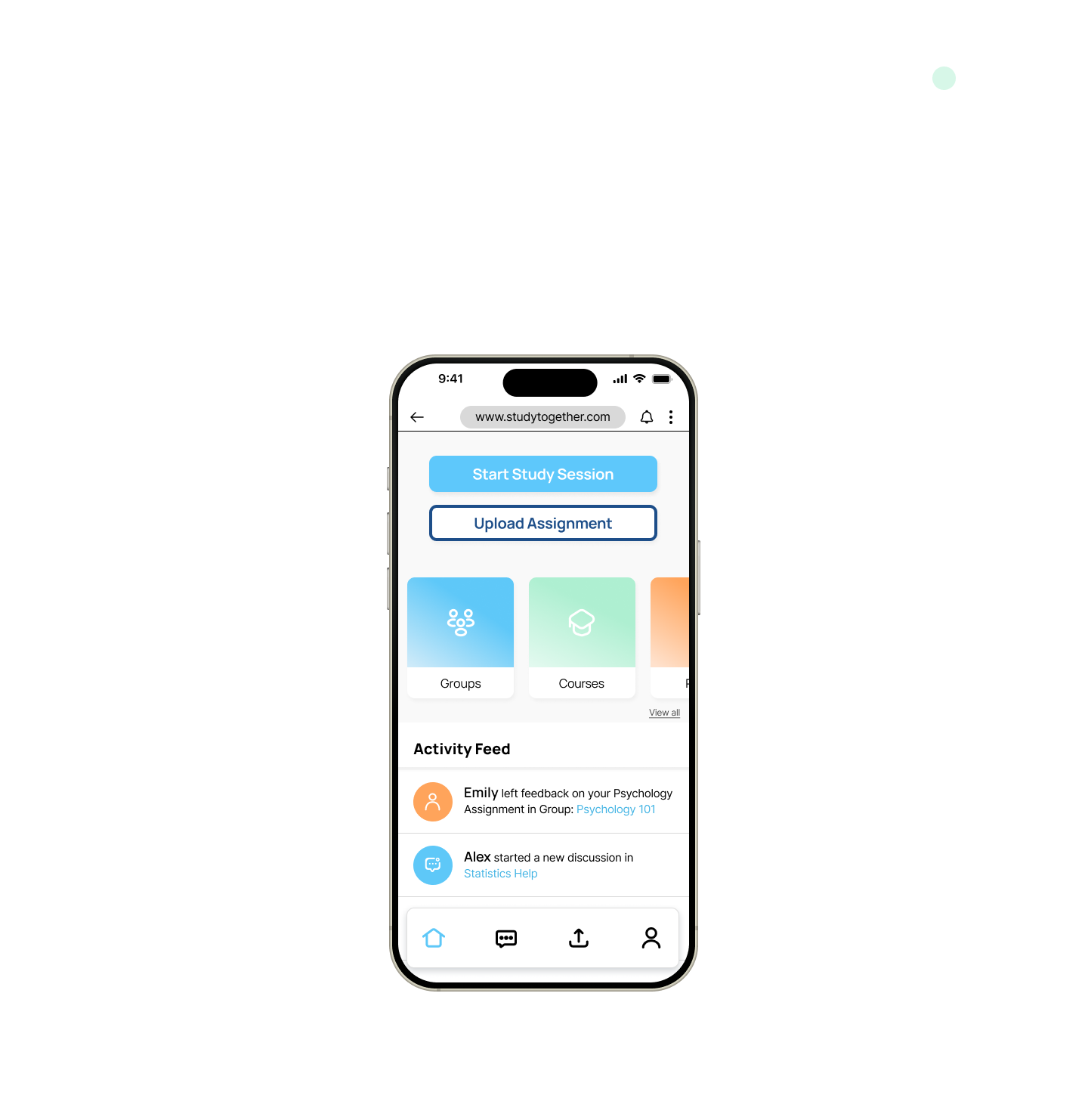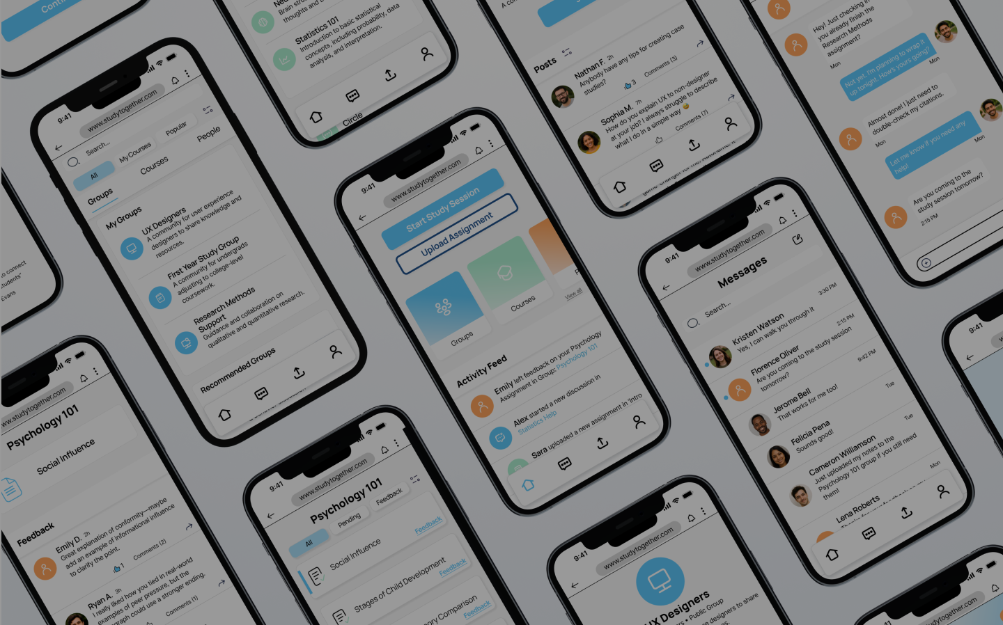 Study Together is a responsive web application designed to help students collaborate, stay accountable, and improve their academic success through shared study groups, messaging, and course-based communities. The goal of this UI case study was to create a clean, modern interface that supports clarity, quick interactions, and an uplifting, motivating study atmosphere.
