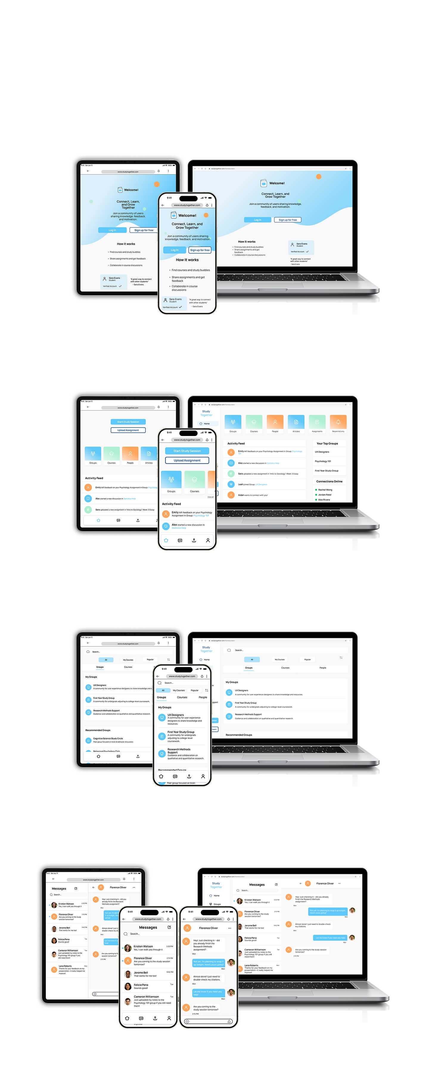 These final screens highlight the complete responsive UI for Study Together across mobile, tablet, and desktop. The design system prioritizes clarity, warmth, and ease of use, creating an experience that feels consistent and supportive no matter where students access it. Each screen reflects the refined components, interactions, and visual patterns developed throughout the project.