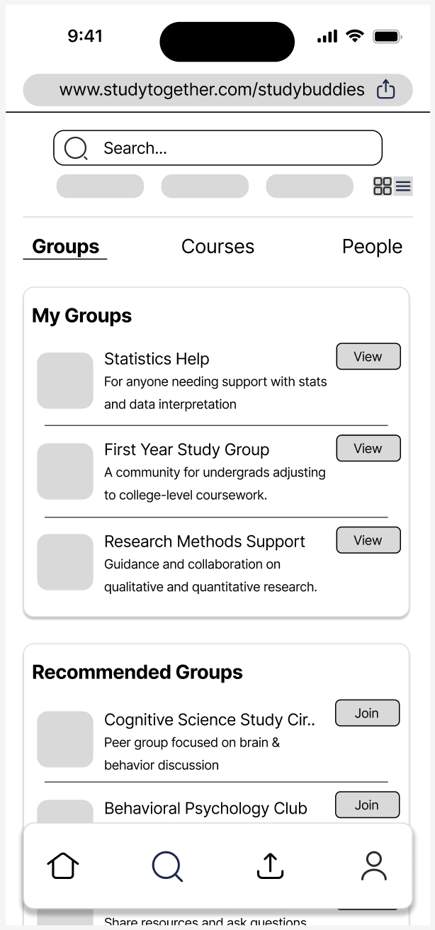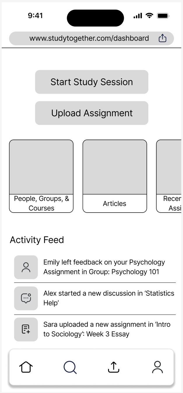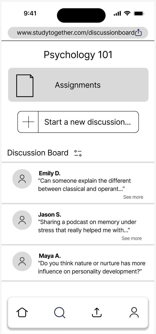 A responsive web app for students to connect through study sessions, discussion boards, and collaborative courses. Currently in mid-fidelity design and usability testing stages.